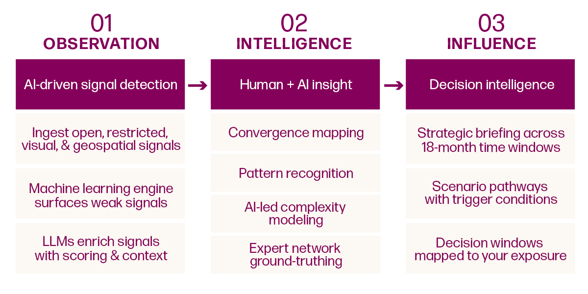 Analysts sit inside the detection process, shaping how convergence is understood, stress-testing assumptions, and translating signals into exposure-specific meaning.Strategic Judgment